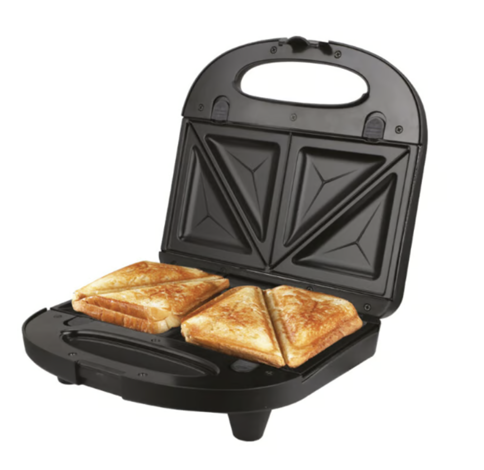 Sandwichera Aiwa AW-SD5000 de 700W en color negro es ideal para preparar dos sándwiches tostados de forma rápida y uniforme. Cuenta con placas antiadherentes removibles, control de temperatura fija a 200 ± 20 °C, luz indicadora y diseño compacto con almacenamiento vertical. Su carcasa de acero inoxidable y manija con seguro ofrecen durabilidad y seguridad en cada uso.